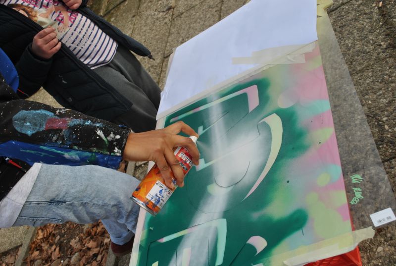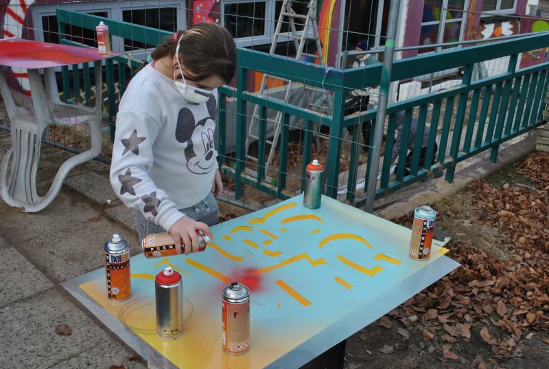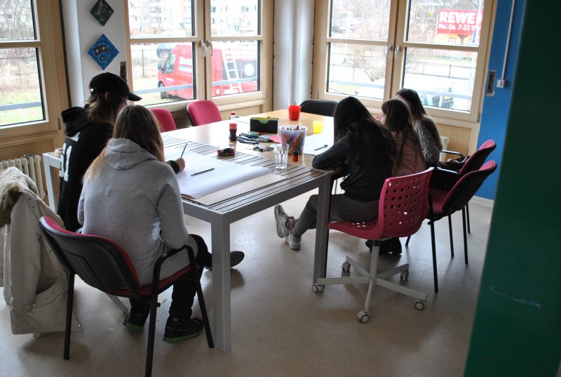 The DJ* workshop at the Schilleria in Neukölln was bustling and noisy, but there were some very DJ-enthusiastic girls who enjoyed trying their hand at the turntables and even managed to build some baby scratches and first smooth transitions between songs one afternoon. Girls from Hellersdorf, Neukölln and Lichtenberg took part in the skateboard workshop at the Statthaus Böcklerpark . The workshop on graffiti & street art at the youth club Manege was particularly successful, because for the first time girls from the nearby emergency shelter in Karl-Marx-Strasse also took part in the workshop. The next week we started our hip hop dance workshop at the InVia Mädchentreff in Karlshorst. At the rap workshop in the Tivolotte, girls from the NUK Ruschestraße texted together with girls from the Tivolotte and the girls club Schilleria. At the street art/graffiti workshop in Hellersdorf's Hella Klub it was mainly girls from the Ruschestraße emergency shelter and from the Hella Klub itself who took part.