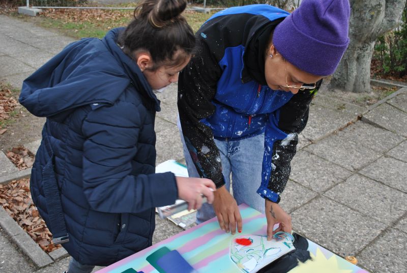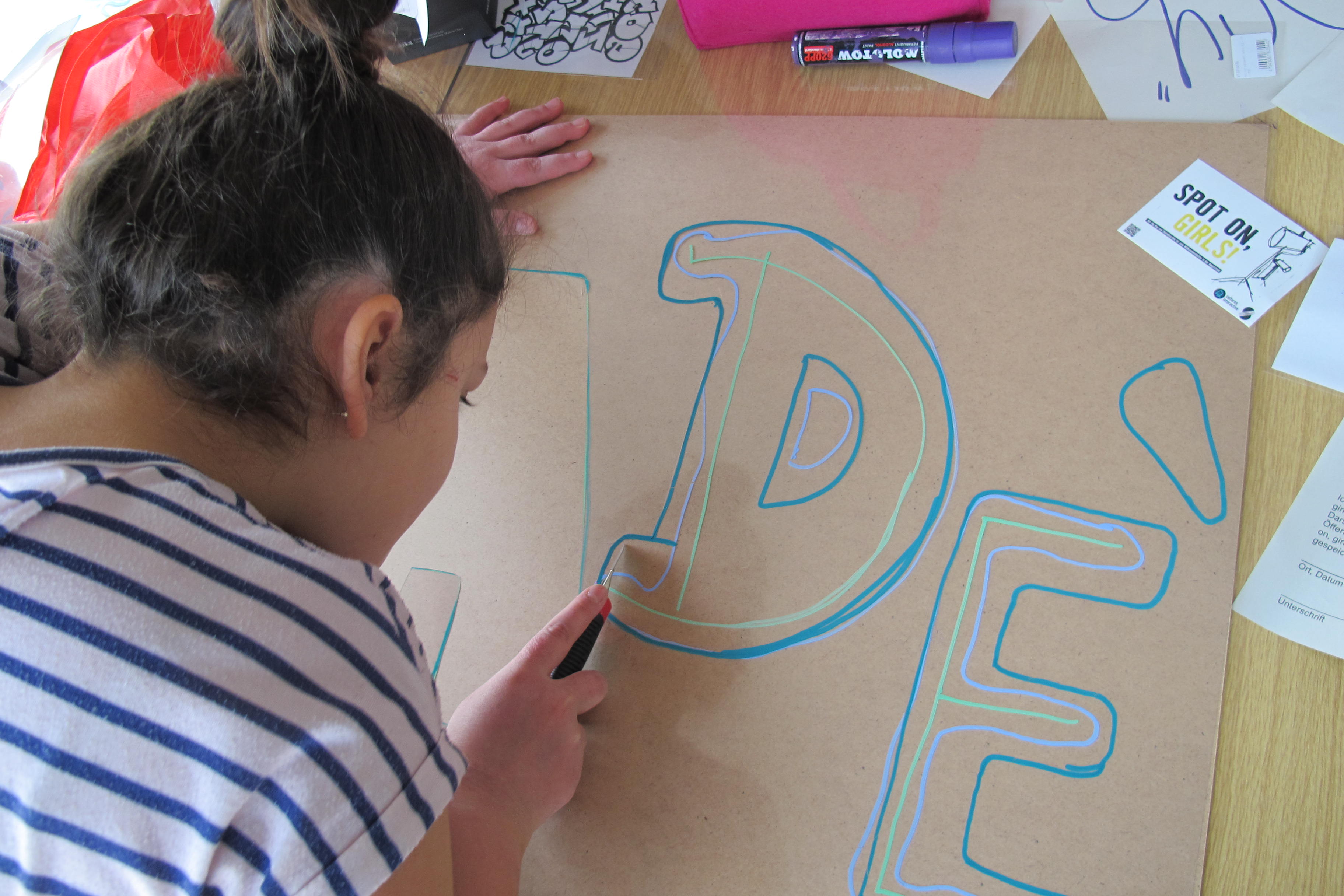 Following our winter break week, we met up with the girls again for the first time for a graffiti/street art workshop at Hella Klub in Hellersdorf. The participants had already thought during the winter break week that they would like to design the flyers and posters for the closing festival themselves, so we arranged to meet at the Hella Klub to design and draw the flyers there and to create stencils with "Spot on, girls". We took advantage of the whole Saturday at the Hella Klub. Almost all the girls who had participated in the winter break week were there again. The logistics of getting there were a bit complex, as we had to gather girls from different shelters and girls' meetings in Neukölln, Tempelhof Lichtenberg and Hellersdorf and first collected them at different meeting points to travel together to the Hella Klub. The flyers turned out beautifully. We couldn't even decide which flyer to use for the invitation in the end and decided to duplicate all the flyers. So there was one flyer in Farsi, one in Arabic and a total of four different flyers in German.